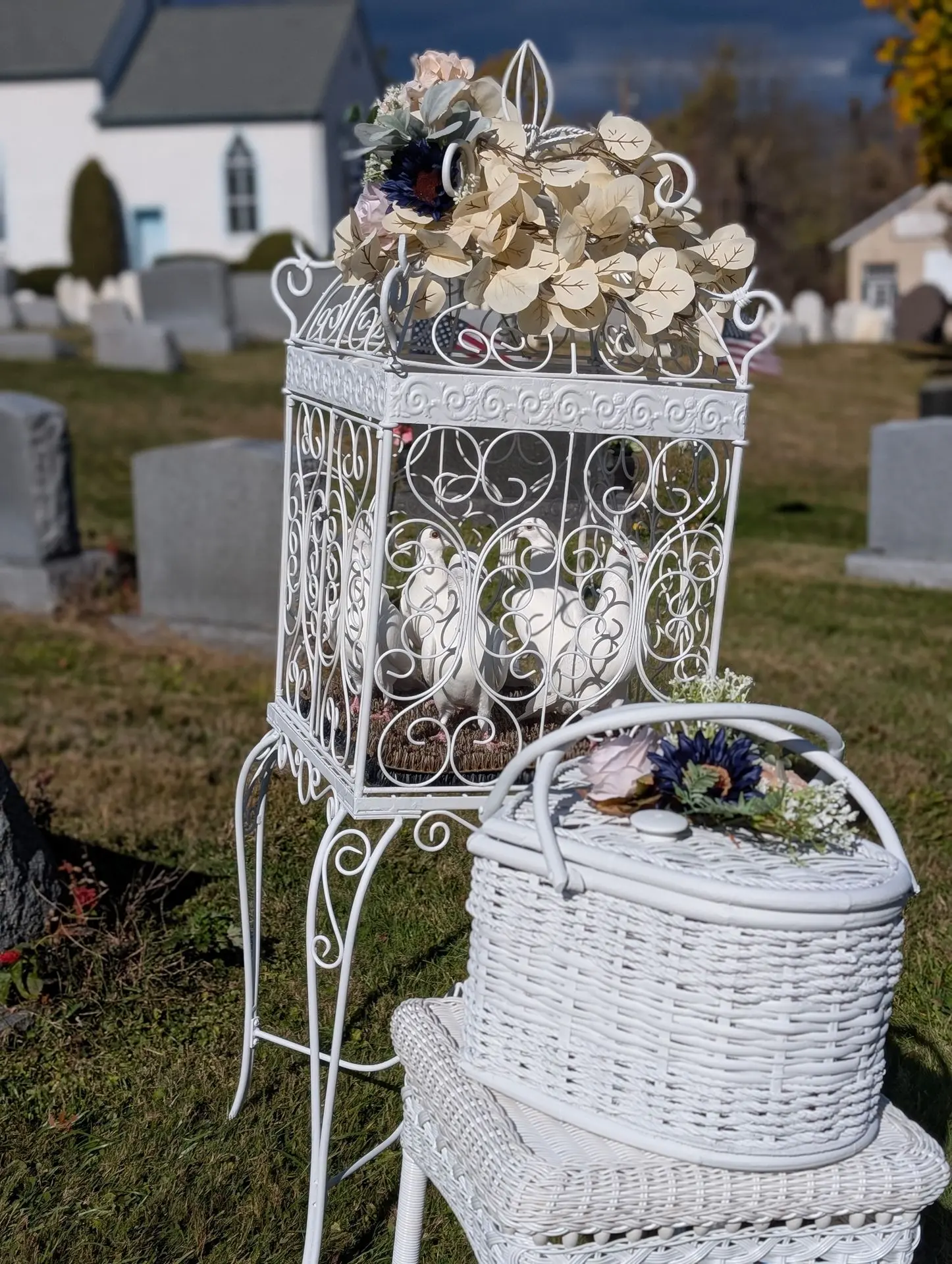 Heart shaped wicker basket to be opened by a loved one, releasing a single dove representing the spirit of the deceased.